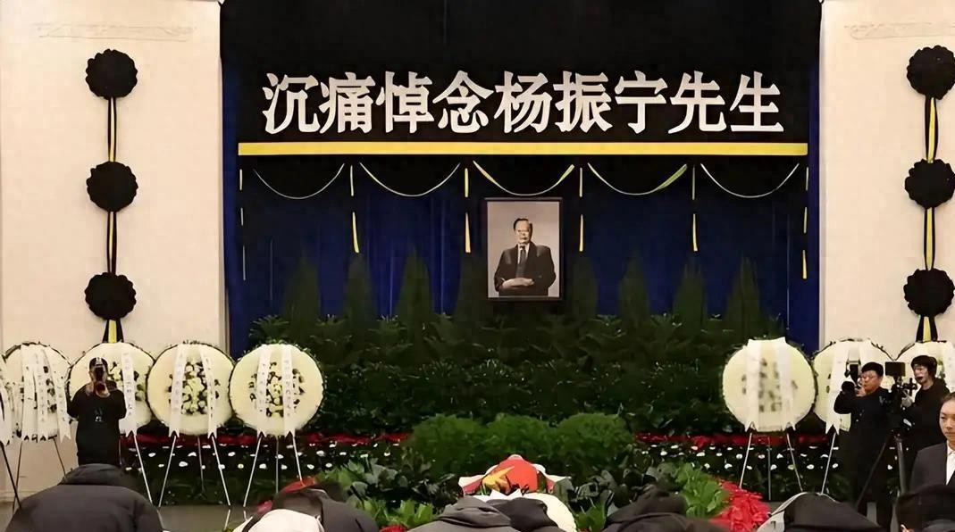 杨振宁的遗体被五星红旗和翠柏包围,仿佛精神与贡献永不朽!