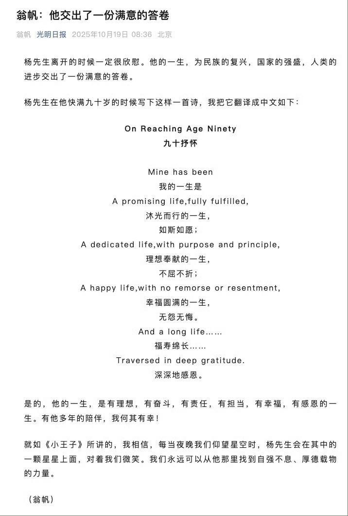 这也是杨振宁需要的,翁帆也一直尊重他的想法。
